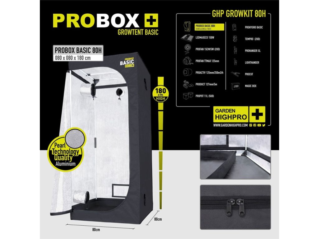 - PROBOX BASIC: kompaktný a robustný stan s rozmermi 80x80x180 cm je ideálny na maximálne využitie priestoru a optimalizáciu rastu vašich rastlín v kontrolovanom prostredí.
